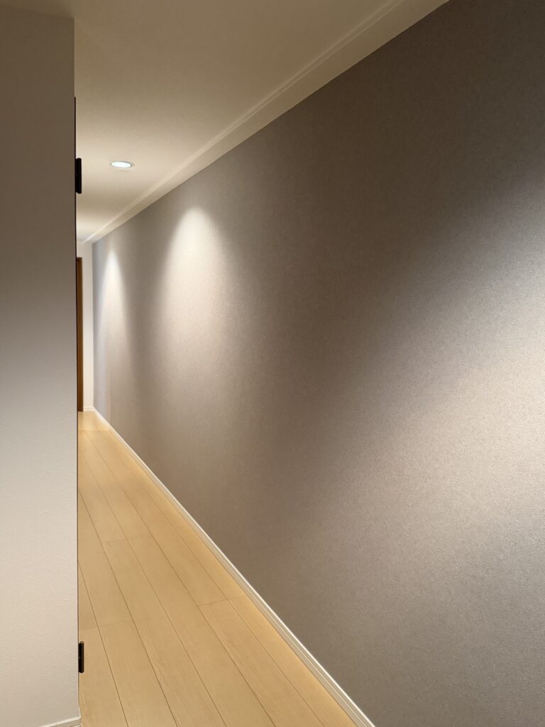 効果的に壁に光を当てることで、ホテルライクな高級感のある廊下に大変身。