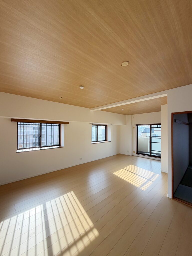 暖かな光の入る広いリビングでは、天井を木目にすることで、平面的な広がりを感じ